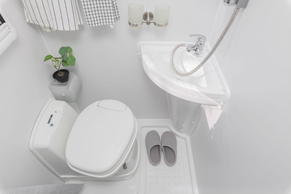 卫生间在厨房区域的后方,包括淋浴花洒、毛巾架、浴室镜、手纸盒、卫浴帘、吊柜、洗手盆、杯托、集便式马桶等。水路方面,净水箱容积120L,水箱电加热防冻,灰水箱容积45L。