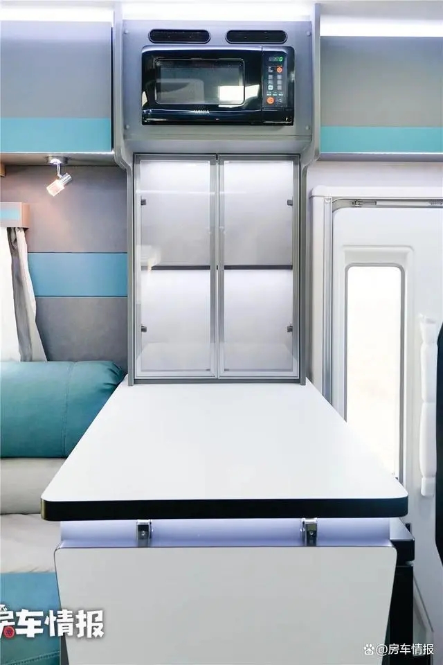 车尾部依然是独立厨卫区域,靠近车门一侧是车内的厨房,这里提供了洗菜池、微波炉、洗烘一体洗衣机、房车专用冰箱、储物抽屉等设备。