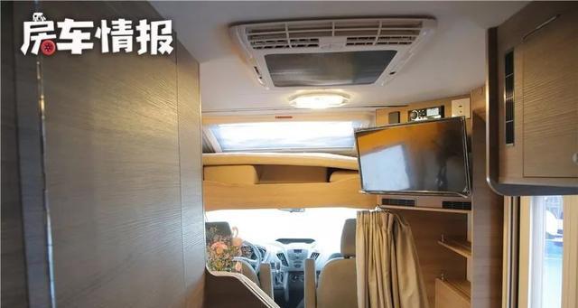 接下来我们一起车辆的内部看一下吧!内部布局设计合理,区域分明,整体配色装修风格也是温馨居家。驾驶室上方的小额头区域,空间相对较小,并不能供乘客休息,但是可以当做储物空间,放置一些生活物品。另外,上方还配有一扇天窗,可保证车内良好的空气流动性,以及光照性,为乘客带来一个舒适的旅居环境。