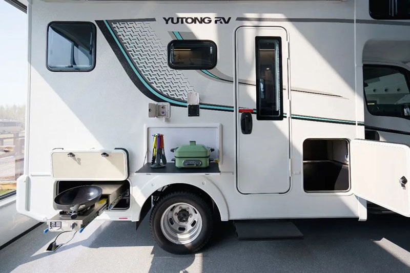 车身右侧设有置物板、水电接口、厨房储物舱体等,户外烹饪更加得心应手。