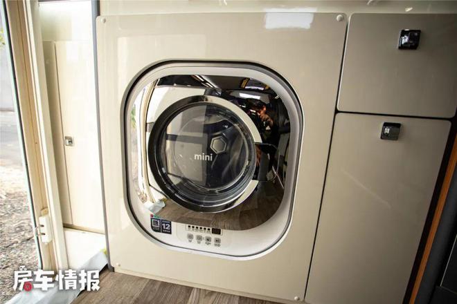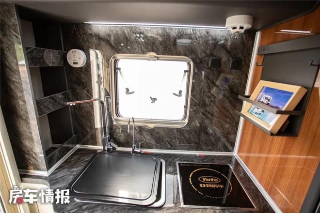 厨房区域配备,高档带盖不锈钢水盆,盖板还可以作为菜板使用,直饮水水龙头,高脚水龙头,多功能微波炉,电磁炉,车载专用冰箱,上方冷冻下方冷藏,大宇2.5公斤洗衣机,橱柜等。