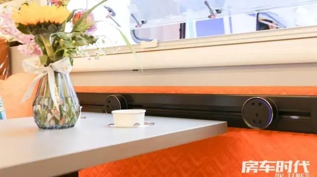 另一侧为对卡座+手动升降桌的设计,桌面上配置有杯槽,旁侧为可移动的电源接口,能够根据使用需求进行调整。对卡座的顶部配置了一台家用变频空调,保障车辆内部一年四季都处于恒温舒适状态。