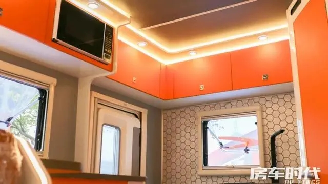 厨房区位于尾门旁侧,主要烹饪区位于车门左侧,台面为L型设计,上方配置有双电磁炉,提升制餐效率,台面下方内嵌了一台148L车载冰箱,帮助保存新鲜食物,上方吊柜内嵌有一台微波炉,提供了快速制餐条件。